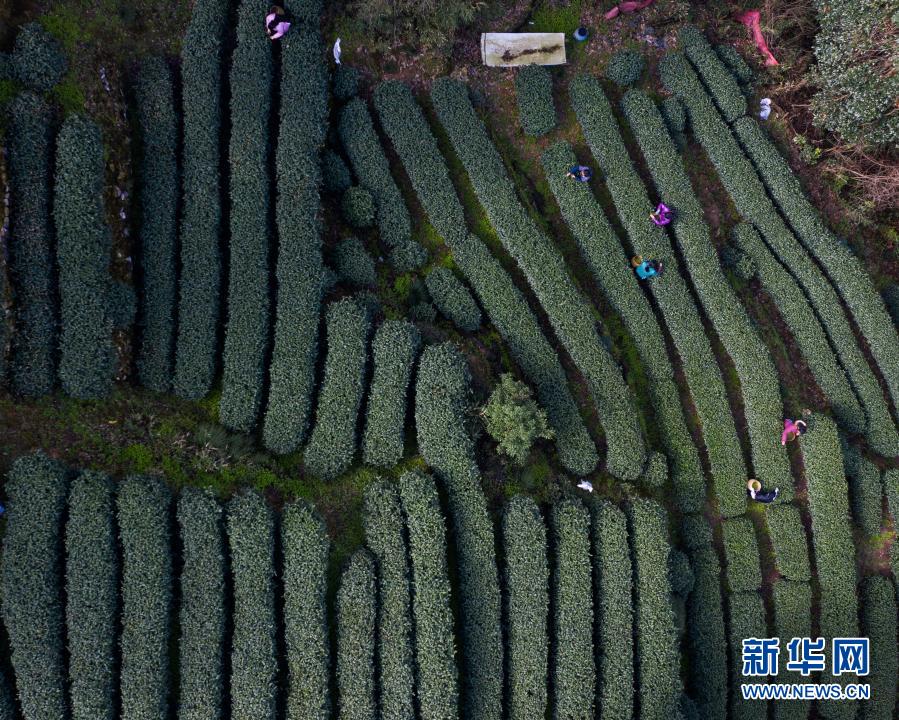 3月12日,在位于杭州市西湖風景名勝區(qū)滿覺隴村白鶴峰的西湖龍井茶葉基地,茶農(nóng)在采摘西湖龍井頭茶(無人機照片)。