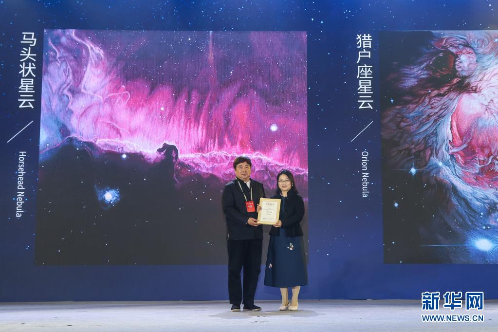 4月24日,在江蘇南京中國航天日主場活動現場,陳英華(右)的“星空”系列蘇繡作品獲得太空探索與藝術創想大賽特別獎。新華社發(崔曉 攝)