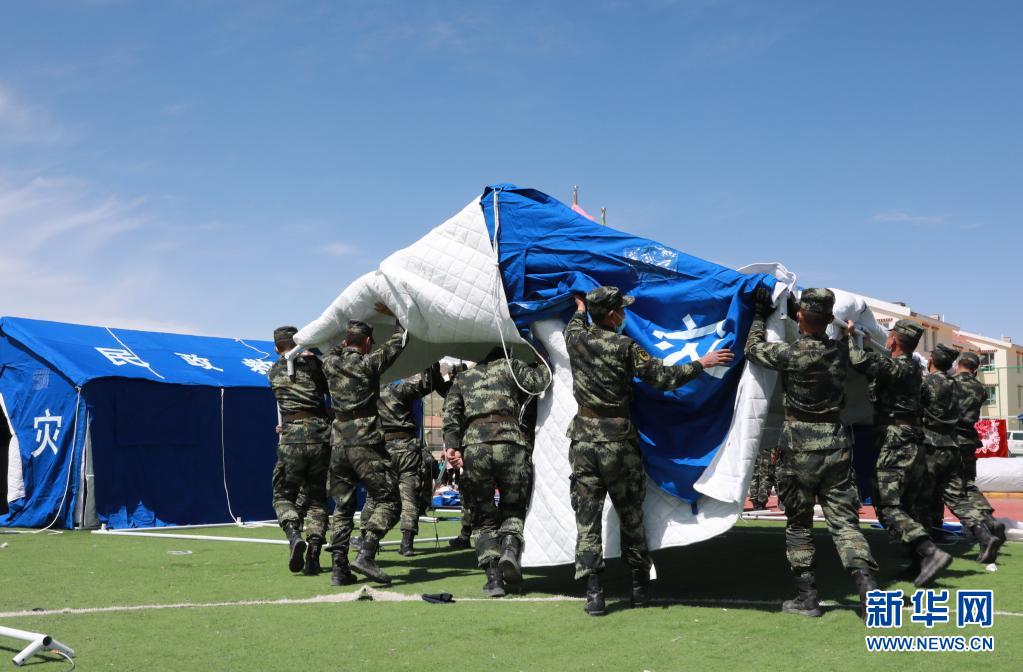 5月24日,武警青??傟牴逯ш牂C動大隊官兵為花石峽鎮藏文中心寄宿制小學搭建帳篷教室。新華社記者 劉新 攝
