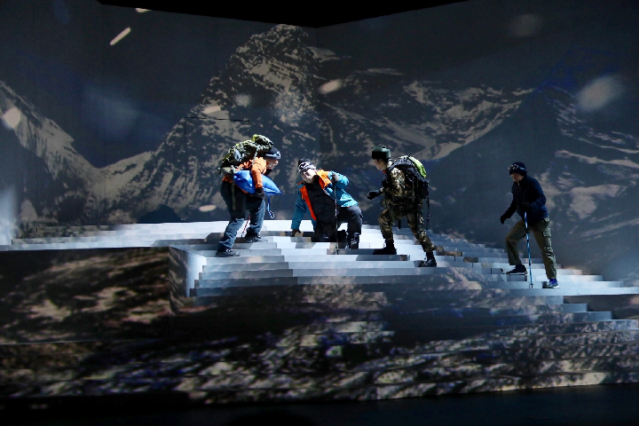舞臺上,話劇《種子天堂》劇情進入最高潮——在缺氧、強風惡劣環境下,鐘揚拼盡氣力來到海拔6000米的高度。當他終于在一堆雜草和冰雪中發現那株頑強的雪蓮時,就像父親看到自己剛出生的嬰兒,臉上掛著深深的喜悅,凝望良久……