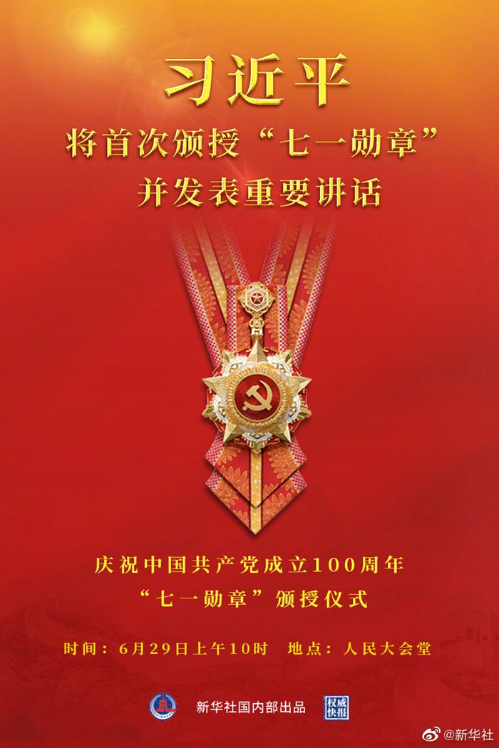 慶祝中國(guó)共產(chǎn)黨成立100周年“七一勛章”頒授儀式將于29日上午10時(shí)在人民大會(huì)堂隆重舉行。習(xí)近平為“七一勛章”獲得者頒授勛章并發(fā)表重要講話。
