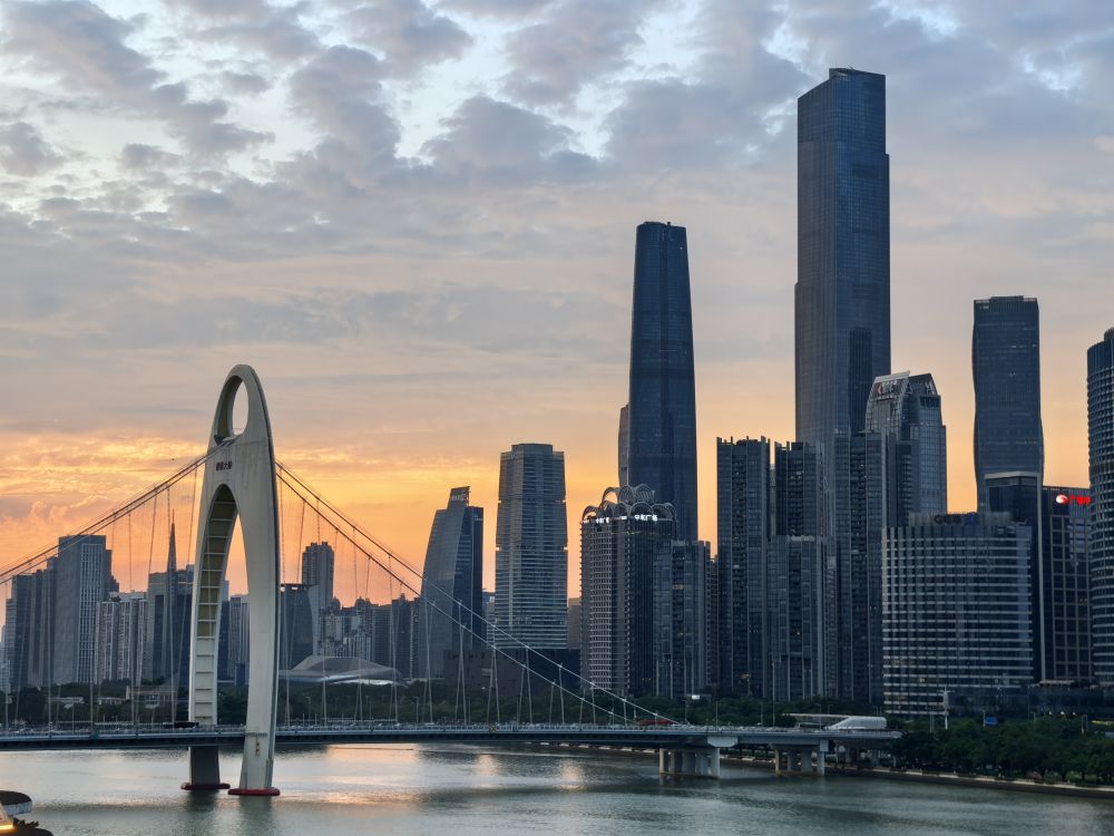 日落时分,步出中山大学北门,宽阔的珠江将都市黄昏一分为二。橙红色的夕阳缓缓沉入远方的天际,将漫天云霞染成了暖金色,与高处淡蓝色的天空温柔相接。珠江两岸的现代楼宇错落林立,玻璃幕墙反射着落日的余晖,不远处广州塔高耸入云,宛如一根镶着金边的玲珑玉柱,天空的瑰丽与城市的灯光逐渐倒映在江面上。