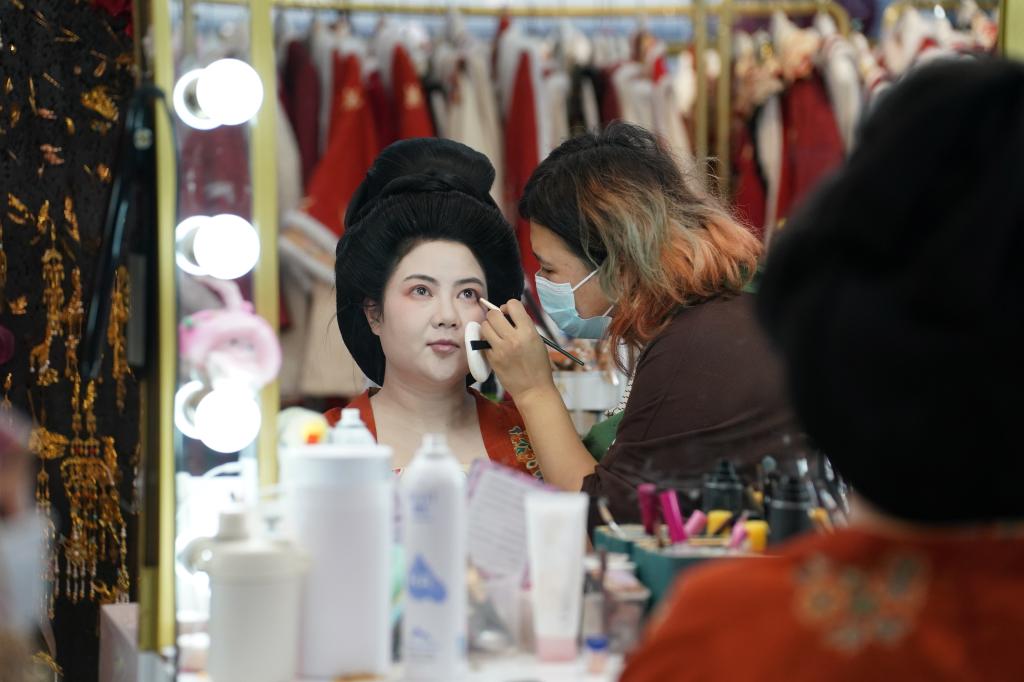 1月9日,李欢在进行唐果子制作体验项目前化唐妆。
