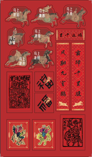 春条部分特别新增两幅“利世”主题的出行甲马春条,图案取自《中国木版年画集成·云南甲马卷》。古时贴于鞍马,祈求路途顺畅;今时贴于家门、车内,寓意人生旅途人马平安,招财进宝。