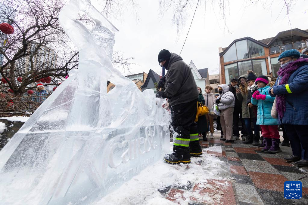 2月18日,冰雕师在加拿大多伦多街头制作冰雕。