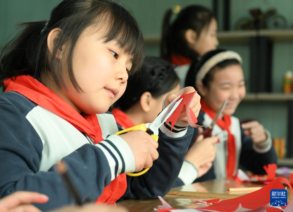2月28日,学生在石家庄市东风小学非遗工坊学习剪纸。