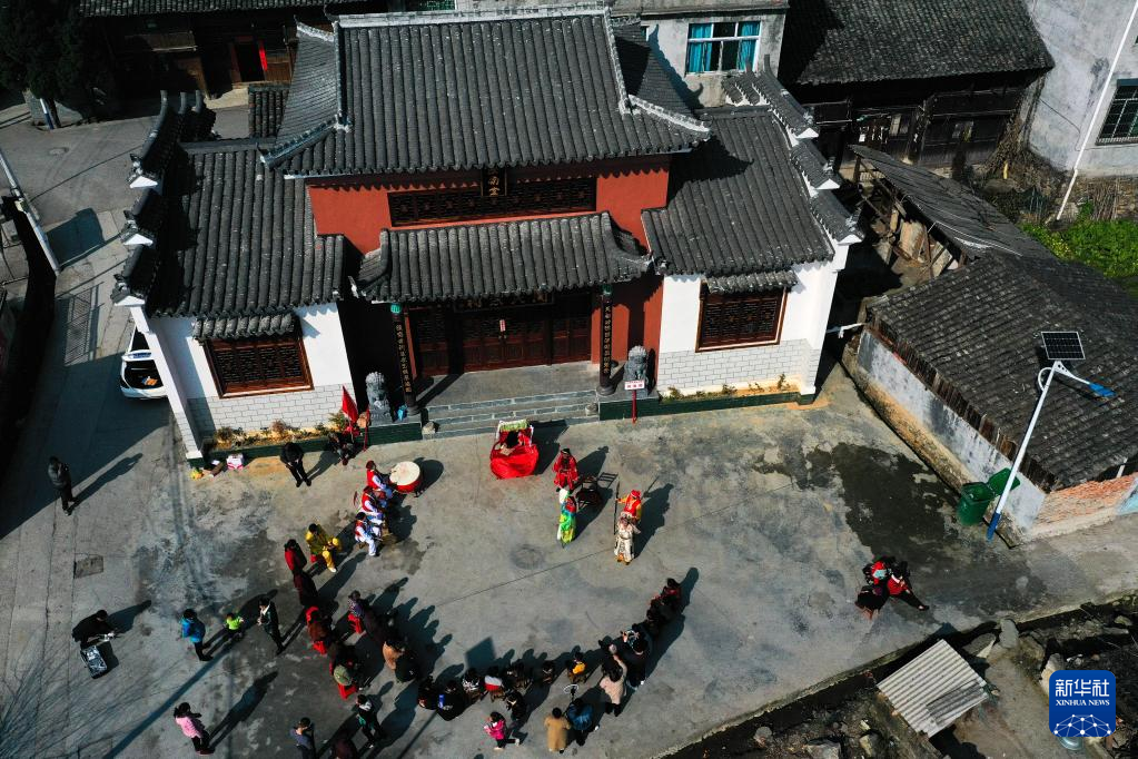 侗戏班在贵州省天柱县凤城街道润松村表演侗戏(2月26日摄,无人机照片)。