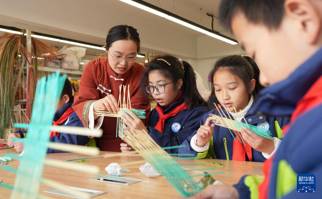 12月30日,徐无瑕(左二)在工作室教前来研学的小学生做竹编。