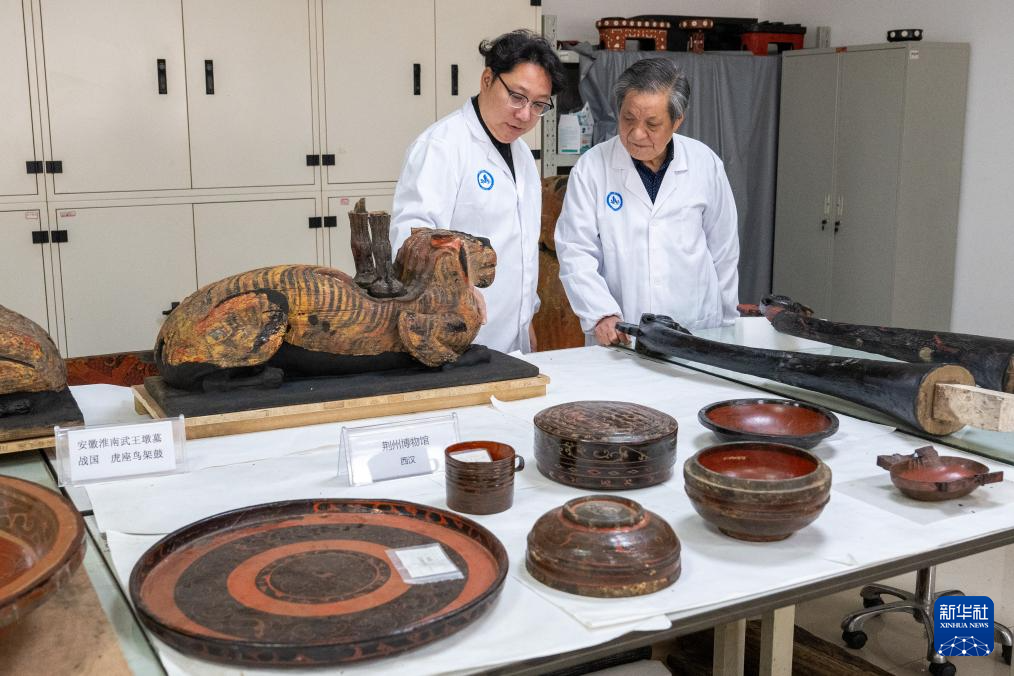 1月9日,在湖北荆州文物保护中心,荆州文物保护中心副主任吴昊(左)与父亲吴顺清查看近期正修复的虎座鸟架鼓。