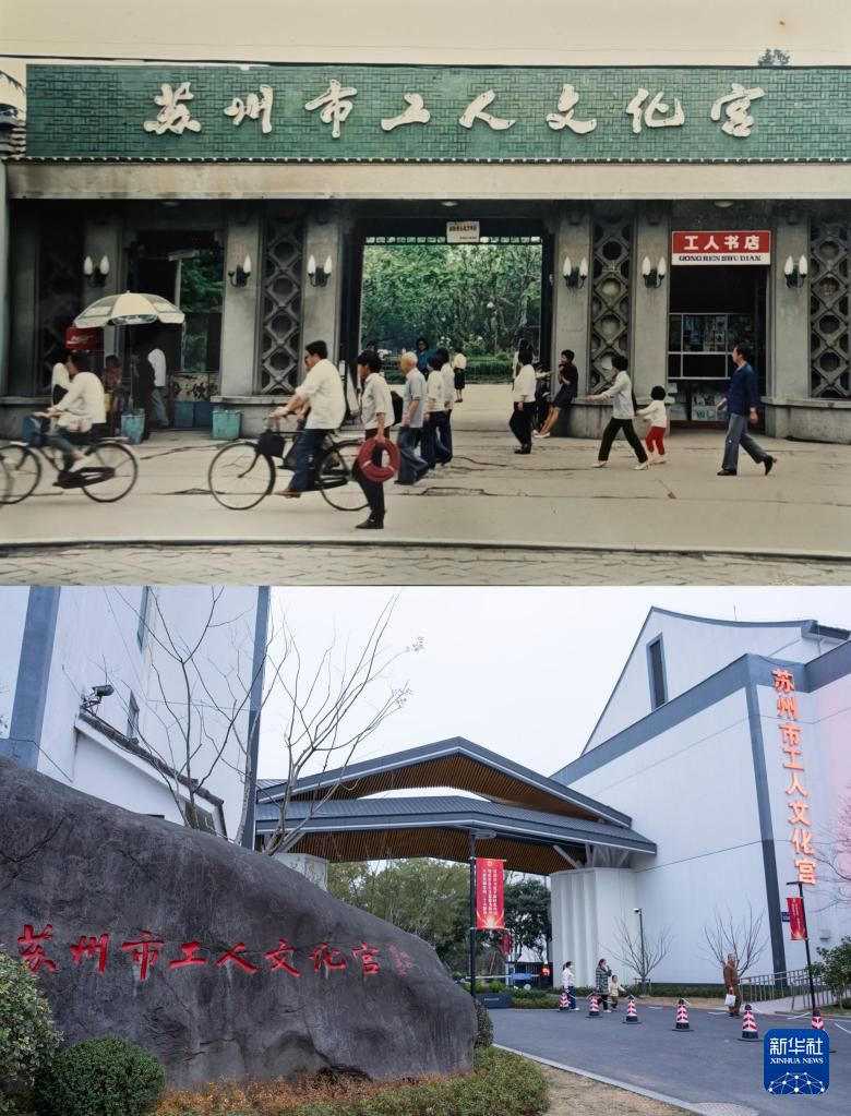 拼版照片:上图为1991年拍摄的苏州市工人文化宫文化楼(资料照片);下图为升级改造后的文化楼(2026年1月18日摄)。