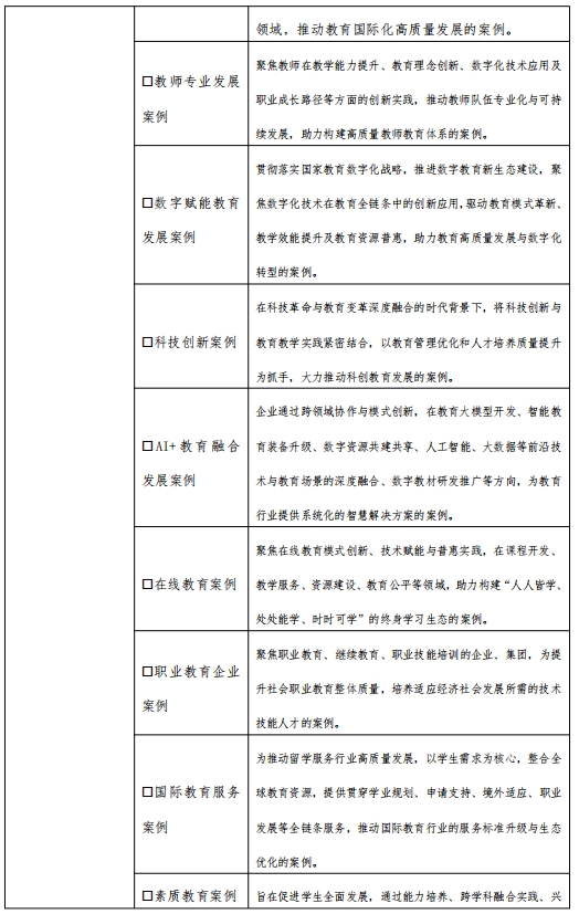 本次征集的案例涵盖教育公益、匠心育人、思政教育、产教融合、国际化办学、教师发展、数字赋能、科技创新、AI+教育融合发展、在线教育、职业教育企业、国际教育服务、素质教育、教育品牌影响力、综合实力教育集团等15大类,每类将评选出10个案例。