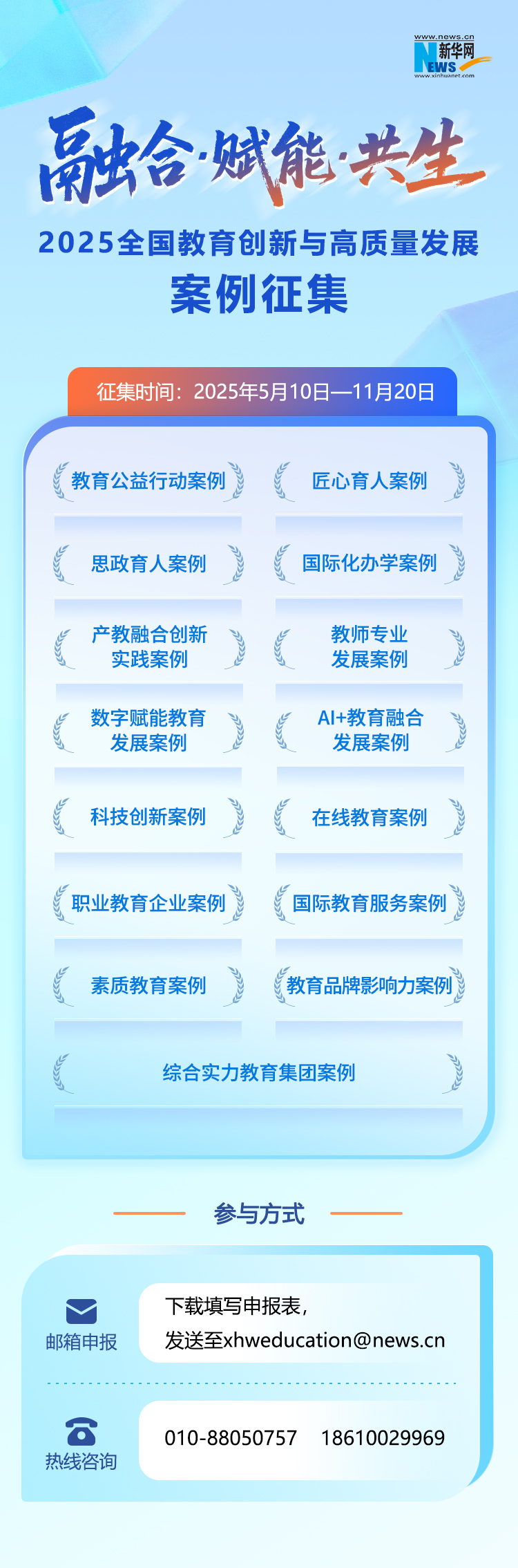 为深入贯彻落实“十四五”教育发展规划,推动教育数字化转型与高质量发展,挖掘和推广全国教育创新实践成果,由新华网主办,北京首冠传媒有限公司承办的“2025全国教育创新与高质量发展案例征集活动”即将启动。