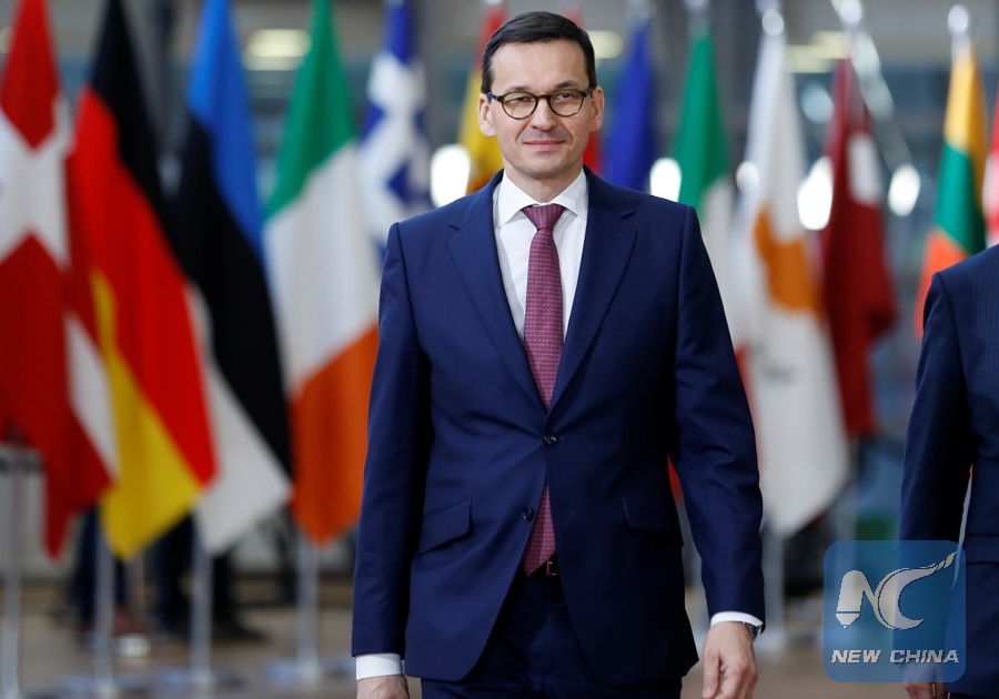 Polish Prime Minister Mateusz Morawiecki arrives at EU headquarters for an EU Summit in Brussels, Belgium, Dec. 14, 2017. (Xinhua/Ye Pingfan)