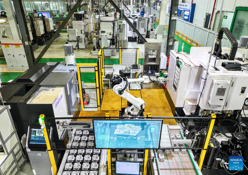 A drone photo shows an automated workshop at the precision engineering base of Chongqing Shunduoli Motor-vehicle Co., Ltd. in Beibei District of Chongqing, southwest China, May 9, 2025. The combined economic output of southwest China's Sichuan Province and Chongqing Municipality has exceeded 10 trillion yuan (about 1.44 trillion U.S. dollar) in 2025, accounting for approximately 7.2 percent of the national total. (Xinhua/Wang Quanchao)