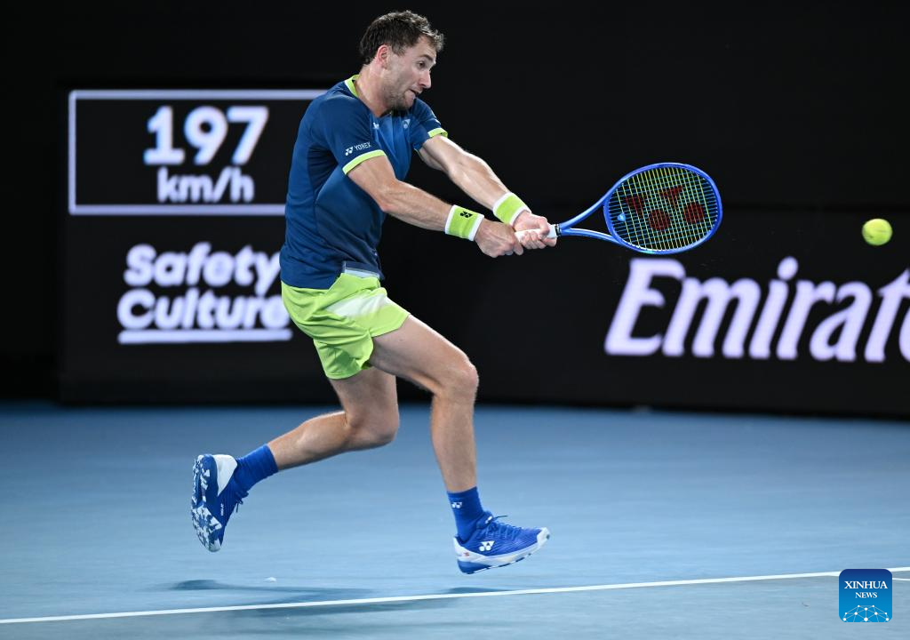 Casper Ruud hits a return during the men's singles 4th round match between Ben Shelton of the United States and Casper Ruud of Norway at the Australian Open tennis tournament in Melbourne, Australia, Jan. 26, 2026. (Photo by Wang Shen/Xinhua)