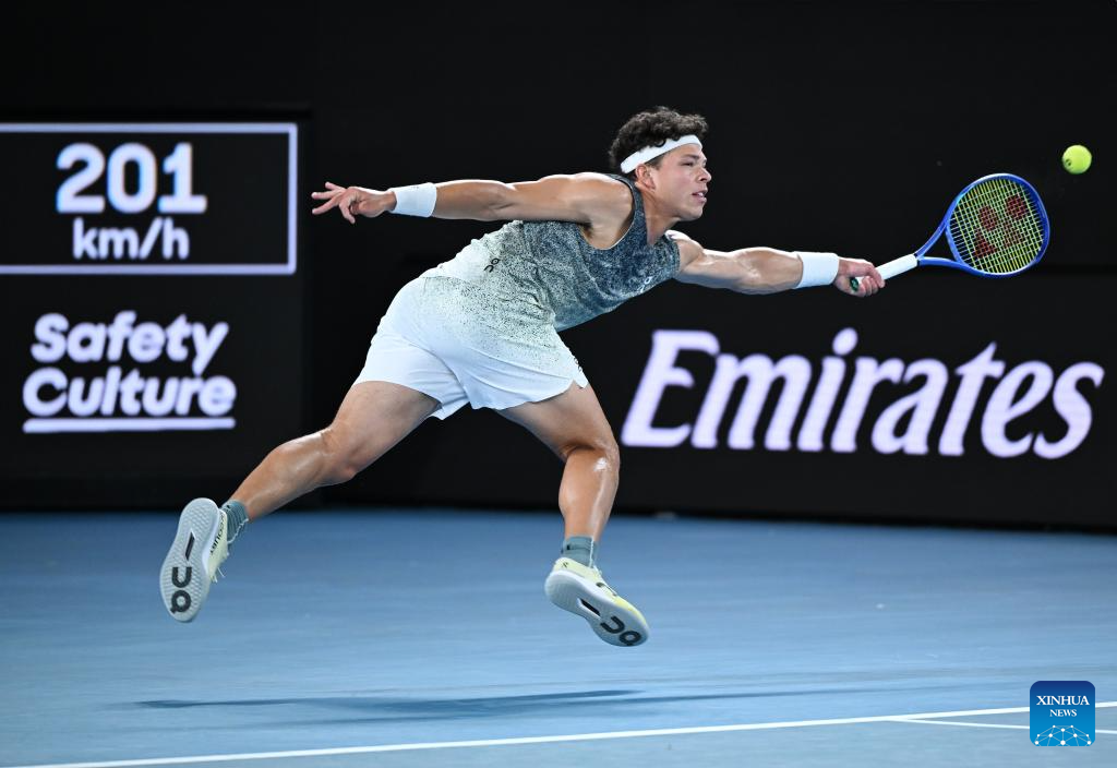 Ben Shelton hits a return during the men's singles 4th round match between Ben Shelton of the United States and Casper Ruud of Norway at the Australian Open tennis tournament in Melbourne, Australia, Jan. 26, 2026. (Photo by Wang Shen/Xinhua)