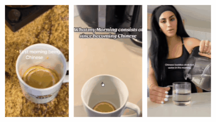 This compilation GIF shows global netizens practicing Chinese wellness habits, such as drinking hot tea and ginger tea. (Composite from TikTok users)
