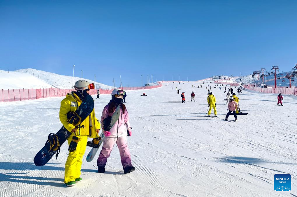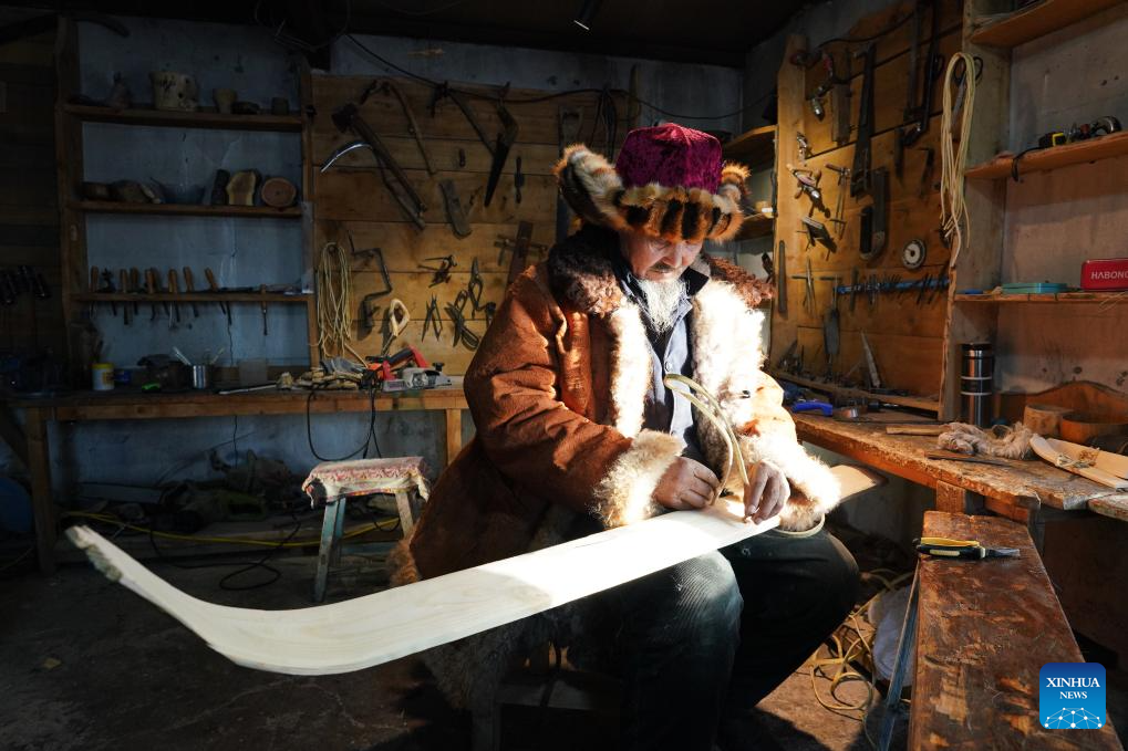 URUMQI, Jan. 28 (Xinhua) -- "Who could have imagined 20 years ago that our snow would turn into a treasure mountain bringing prosperity?" said Huanishibek Slanbek,a fifth-generation inheritor of the craft of making fur skis in Altay.