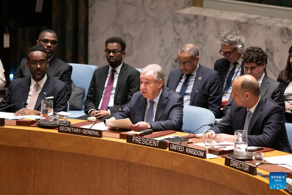 United Nations (UN) Secretary-General Antonio Guterres (C front) speaks at an emergency meeting of the Security Council regarding the U.S.-Israeli attack on Iran at the UN headquarters in New York, Feb. 28, 2026. Guterres on Saturday condemned the military escalation in the Middle East, saying that the use of force by the United States and Israel against Iran, and the subsequent retaliation by Iran across the region, undermine international peace and security. (Xinhua/Xie E)