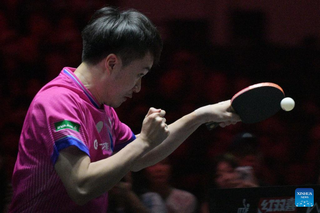 Wang Chuqin of China hits a return during the men's singles final between Wang Chuqin of China and Lin Yun-Ju of Chinese Taipei at the World Table Tennis (WTT) Singapore Smash 2026 in Singapore on March 1, 2026. (Photo by Then Chih Wey/Xinhua)