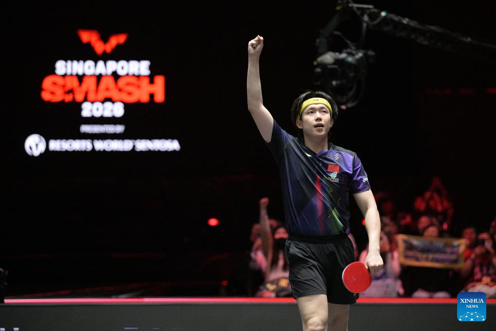 Wang Chuqin of China celebrates during the men's singles final between Wang Chuqin of China and Lin Yun-Ju of Chinese Taipei at the World Table Tennis (WTT) Singapore Smash 2026 in Singapore on March 1, 2026. (Photo by Then Chih Wey/Xinhua)