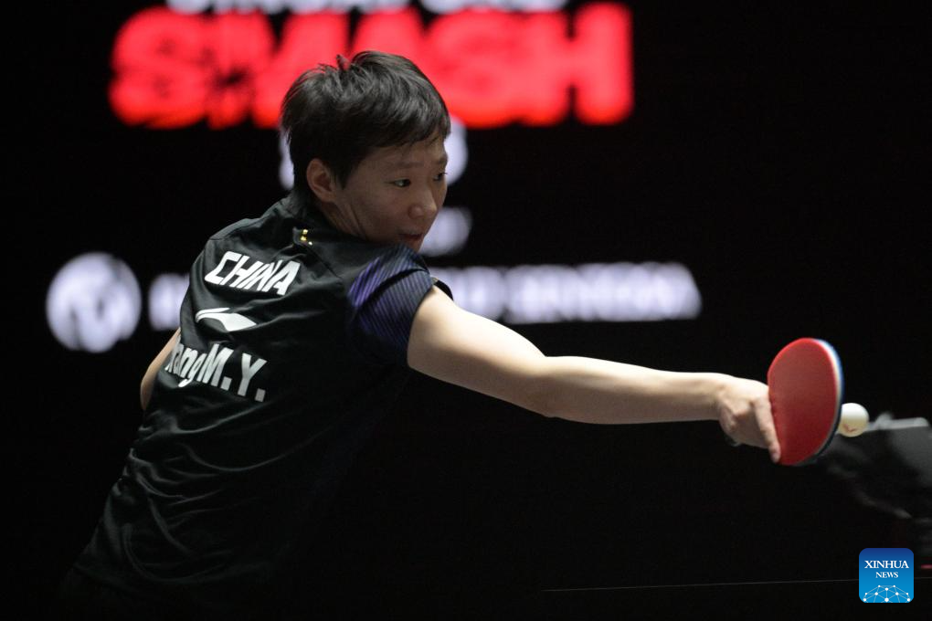 Wang Manyu of China hits a return during the women's singles final between Sun Yingsha of China and Wang Manyu of China at the World Table Tennis (WTT) Singapore Smash 2026 in Singapore on March 1, 2026. (Photo by Then Chih Wey/Xinhua)