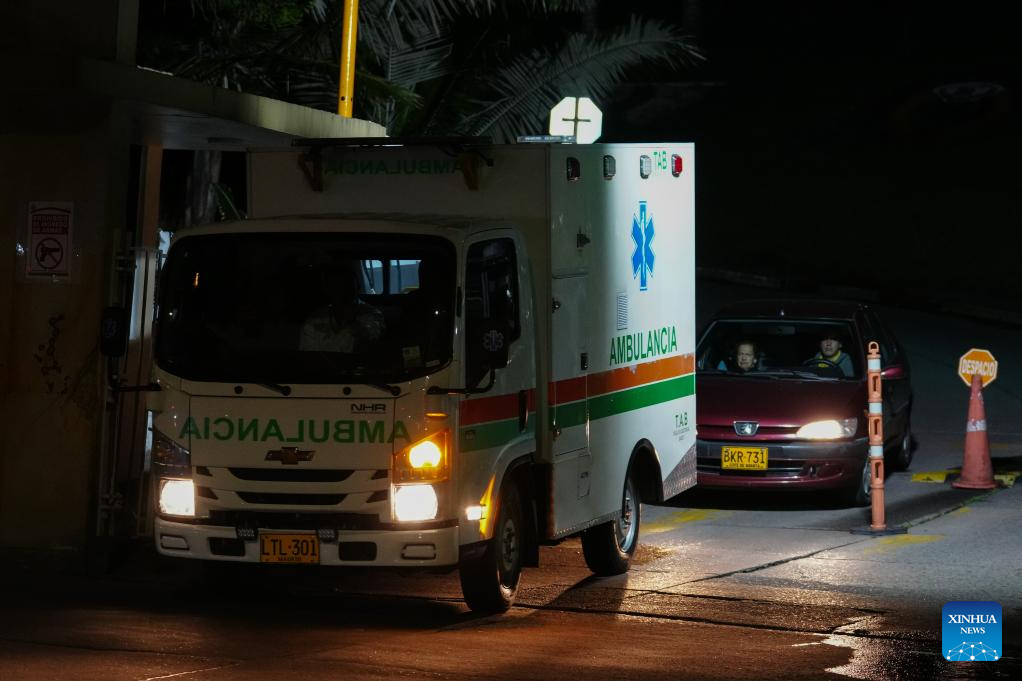 An ambulance leaves a military hospital after transporting the injured from a Colombian military aircraft crash, in Bogota, Colombia, on March 23, 2026. The death toll from a Colombian military aircraft crash in southern Colombia's Putumayo region has risen to 66, with 57 others injured, local media reported on Monday, citing military sources. (Photo by Andres Moreno/Xinhua)