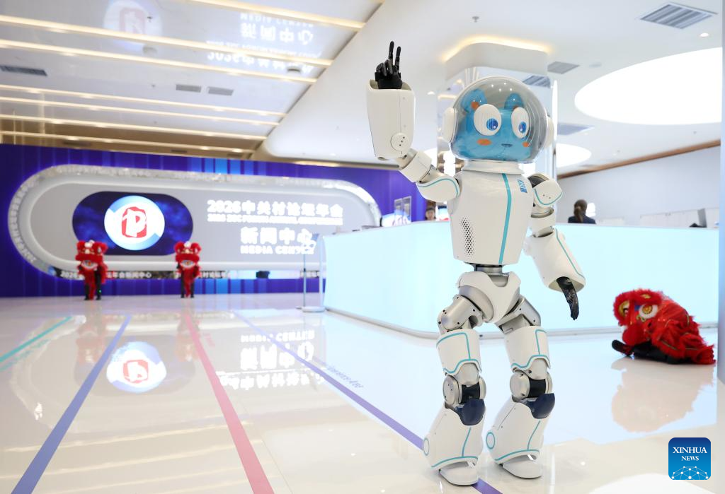 A robot waves to the audience at the media center of the 2026 Zhongguancun Forum (ZGC Forum) in Beijing, capital of China, March 24, 2026. Themed "Full Integration Between Technological and Industrial Innovation," this year's ZGC Forum is held in Beijing from March 25 to 29. More than 1,000 guests from over 100 countries and regions are expected to participate in the forum, which features more than 100 events. (Xinhua/Zhang Chenlin)