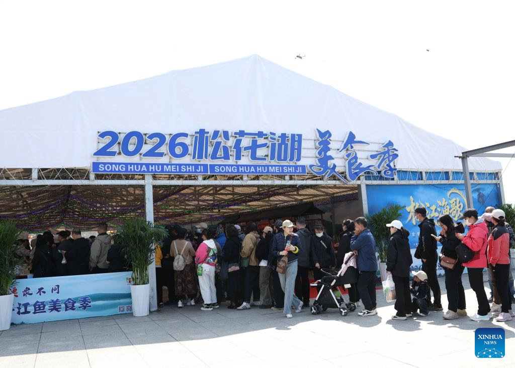 People shop at a "Kaijiang" fish food festival held beside Songhua Lake in Jilin City of northeast China's Jilin Province, April 18, 2026. A "Kaijiang" fish food festival opened here on Saturday, and will last till May 5. "Kaijiang" refers to the annual springtime thawing of ice-covered rivers in northeast China. Visitors can taste fish and experience local customs in fishing during the festival. (Xinhua/Yan Linyun)