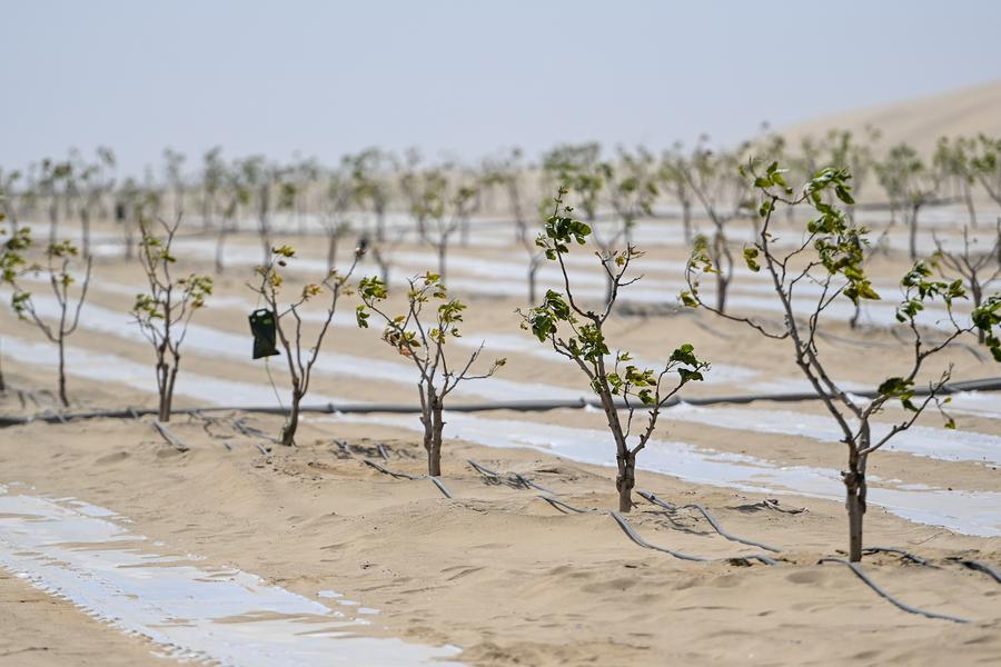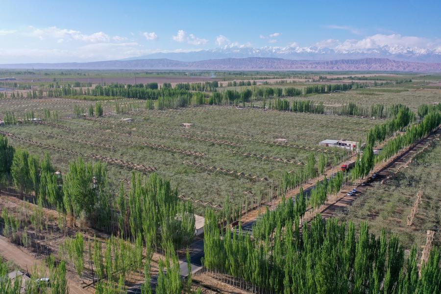 An aerial drone photo shows a view of an ecological restoration and sand control project in Awat County, northwest China's Xinjiang Uygur Autonomous Region, April 14, 2026. (Xinhua/Ding Lei)A villager plants Belamcanda chinensis, a plant used in traditional Chinese medicine, in Yutian County, northwest China's Xinjiang Uygur Autonomous Region, April 15, 2026. (Xinhua/Ding Lei)A villager carries dry reeds to be made for straw checkerboard barriers on the Taklimakan Desert in Yutian County, northwest China's Xinjiang Uygur Autonomous Region, April 15, 2026. (Xinhua/Ding Lei)Villagers make straw checkerboard barriers in Yutian County, northwest China's Xinjiang Uygur Autonomous Region, April 15, 2026. (Xinhua/Ding Lei)Villagers plant Belamcanda chinensis, a plant used in traditional Chinese medicine, at a rose garden in Yutian County, northwest China's Xinjiang Uygur Autonomous Region, April 15, 2026. (Xinhua/Ding Lei)This photo taken on April 16, 2026 shows pistachio tree seedlings at the Taklimakan Desert in Hotan County, northwest China's Xinjiang Uygur Autonomous Region. (Xinhua/Ding Lei)Villagers transplant roses and Scutellaria baicalensis, a plant used in traditional Chinese medicine, and lay drip irrigation tapes on the Taklimakan Desert in Yutian County, northwest China's Xinjiang Uygur Autonomous Region, April 15, 2026. (Xinhua/Ding Lei)A drone photo taken on April 17, 2026 shows a shelterbelt in Makit County, northwest China's Xinjiang Uygur Autonomous Region. (Xinhua/Ding Lei)A drone photo taken on April 14, 2026 shows an apple orchard at a rural cooperative in Aksu City, northwest China's Xinjiang Uygur Autonomous Region. (Xinhua/Ding Lei)■