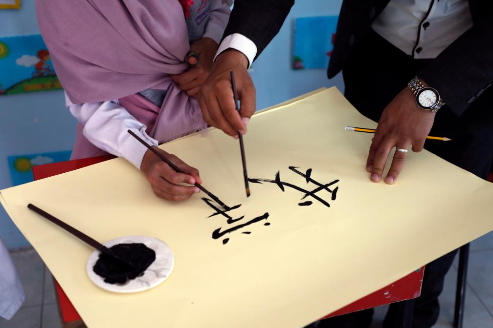 Student learn to write the Chinese characters during a lesson at a school in Sanaa, Yemen, Feb. 10, 2020. (Photo by Mohammed Mohammed/Xinhua)