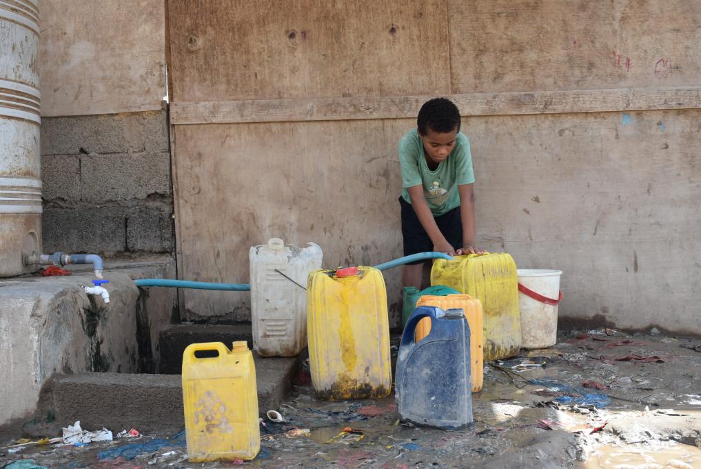 A displaced boy fills plastic containers with drinking water at a temporary displacement camp on the outskirts of Aden, Yemen, Aug. 11, 2025. (Photo by Murad/Xinhua)