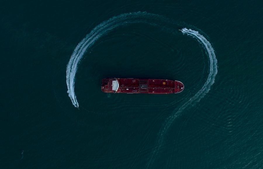 The photo released on July 21, 2019 shows the British oil tanker "Stena Impero" surrounded by speedboats of Iran's Islamic Revolution Guard Corps (IRGC) in the Strait of Hormuz, Iran. (Morteza Akhoundi/ISNA/Handout via Xinhua)
