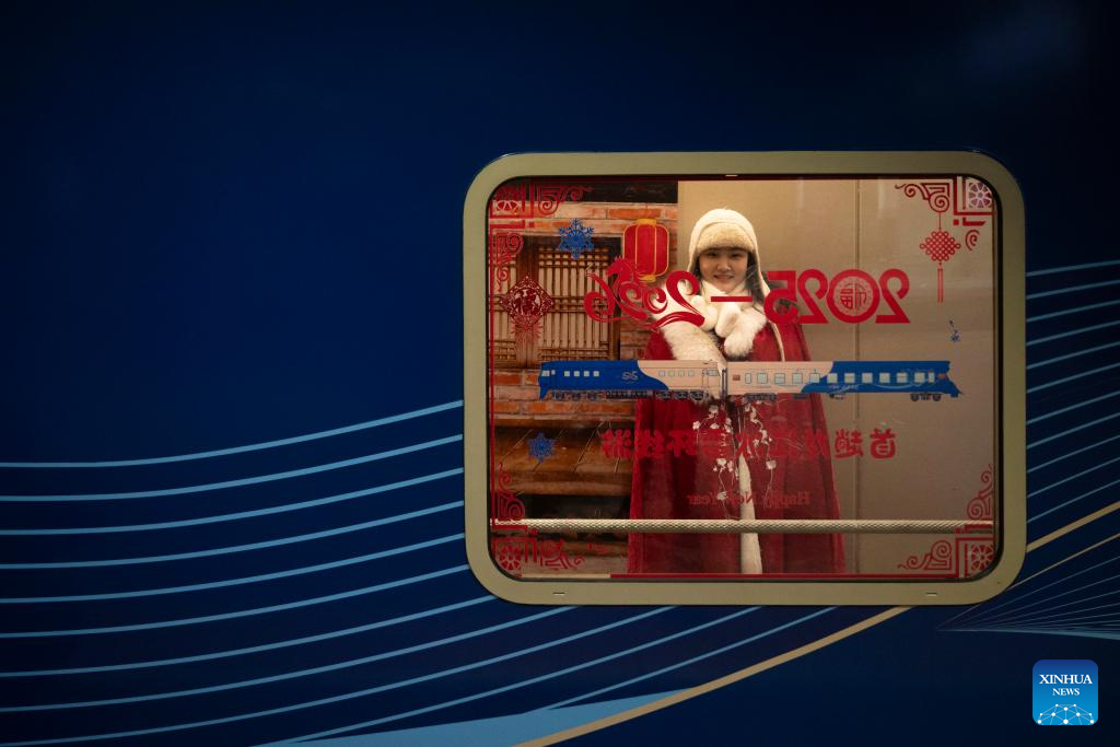 A passenger poses for photos on the Train Y783 in northeast China's Heilongjiang Province, Jan. 25, 2026. Train Y783, a themed tourism train bound for Yabuli featuring travel photography services, was inaugurated Sunday in Harbin. It marks the company's first offering of its kind this year. Operated by China Railway Harbin Group Co., Ltd., the train allows passengers to dress in diverse costumes and avail themselves of photography services. (Photo by Yuan Yong/Xinhua)