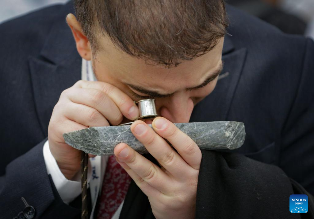 An attendee examines a mineral rock sample with magnifier during the Association for Mineral Exploration (AME) Roundup 2026 at the Vancouver Convention Centre in Vancouver, British Columbia, Canada, on Jan. 26, 2026. The AME Roundup 2026 kicked off here on Monday, featuring a four-day exhibition with exhibitors from around the world showcasing products, technologies and services related to mineral exploration and development. The event runs from Jan. 26 to Jan. 29. (Photo by Liang Sen/Xinhua)