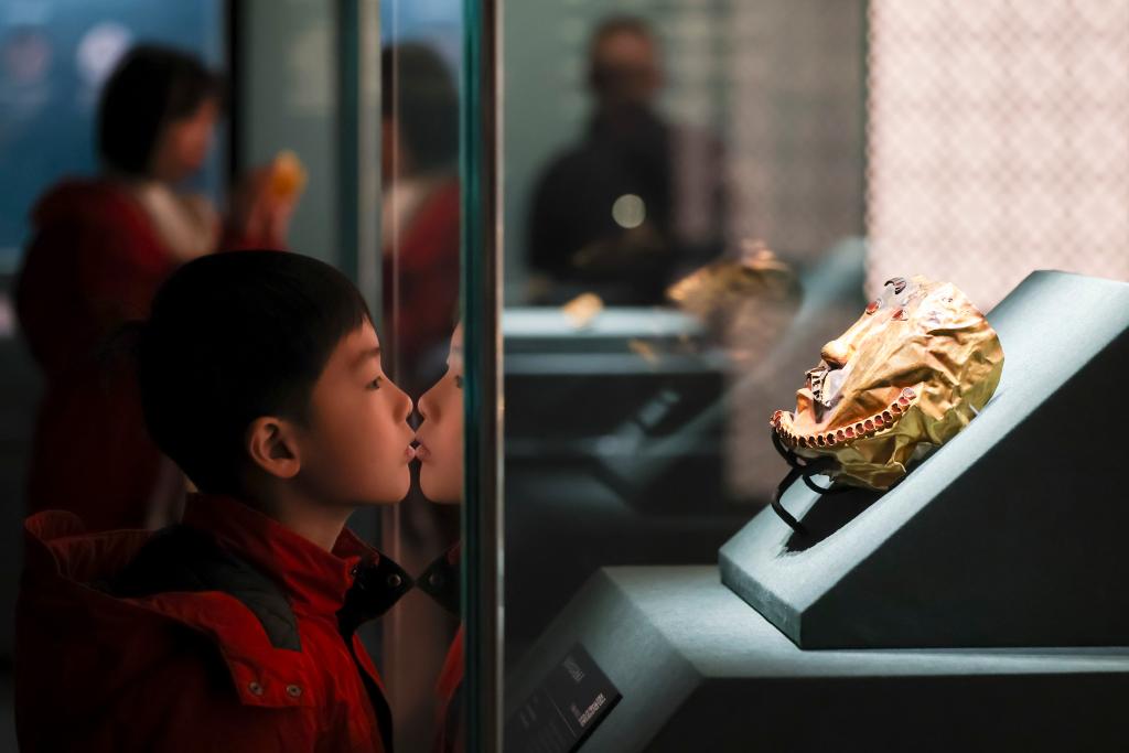 1月20日,观众在公元5至6世纪的镶嵌红宝石金剑鞘展柜前拍照留影。