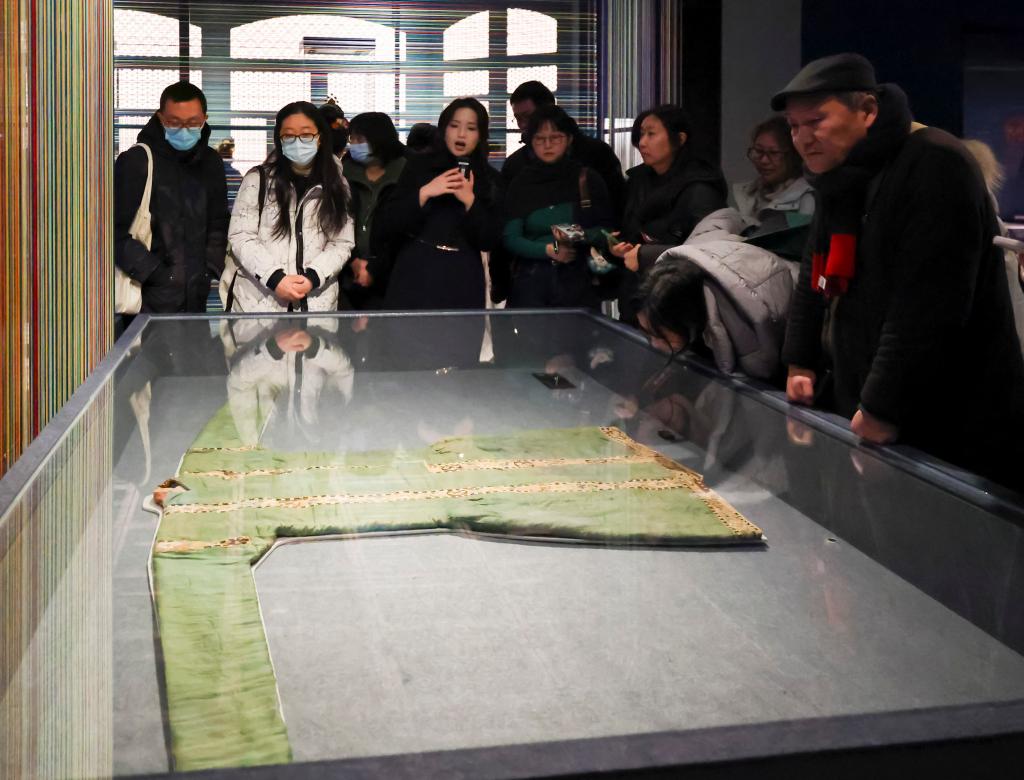 1月20日,观众在展览上观看北宋时期的缂丝饰边绿绢长袍。