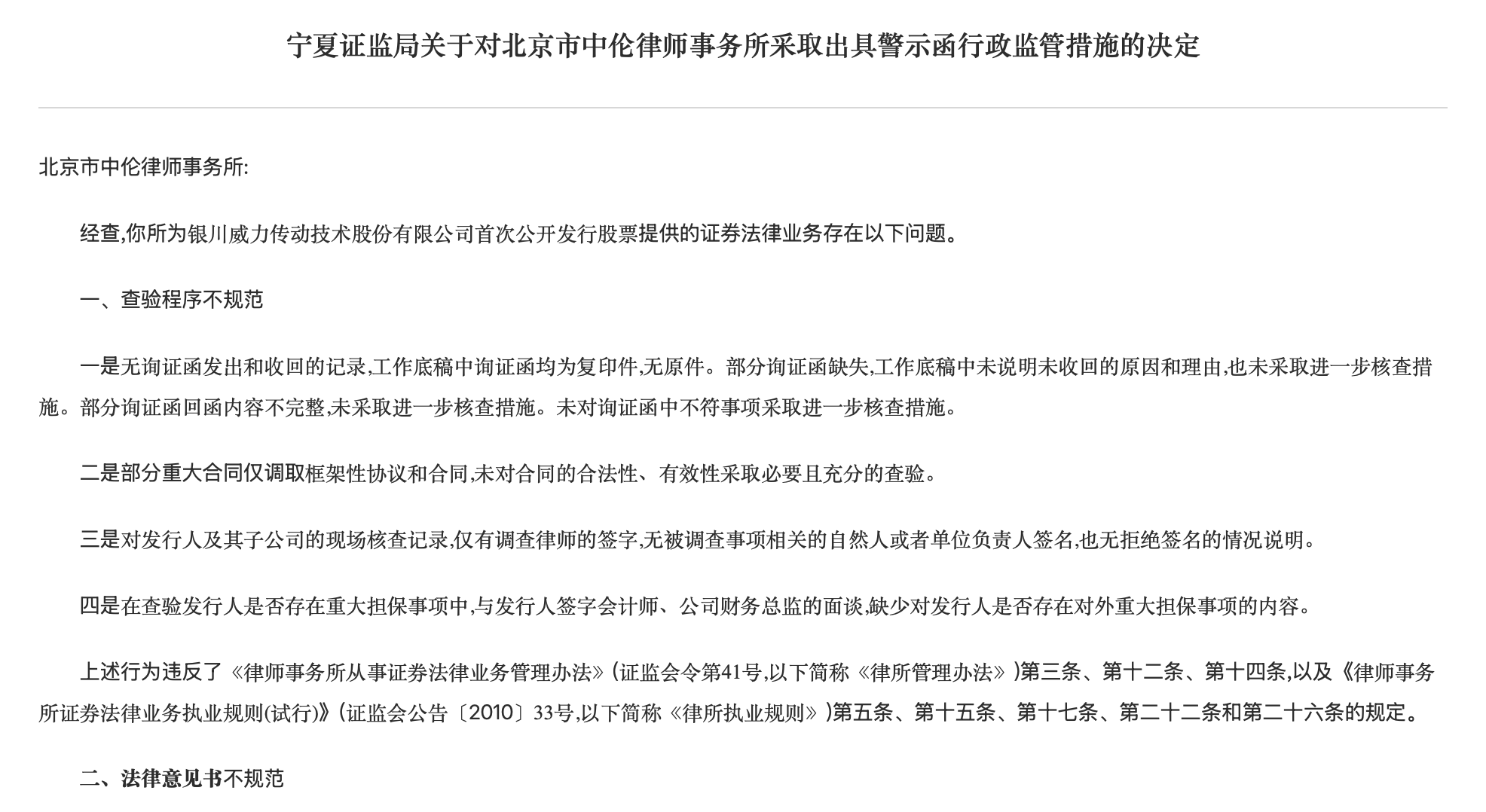 警示函显示,此次中伦律师事务所被出具警示函主要是在为银川威力传动技术股份有限公司首次公开发行股票提供证券法律业务时出现的问题,问题主要包括查验程序不规范、法律意见书不规范两大问题。