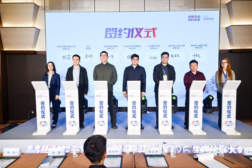 为感谢过去两年合作伙伴的鼎力支持与深度协同,本次大会特别设置了首批优秀合作伙伴授牌环节。获授牌伙伴包括上海元启智体科技有限公司、河南石更科创有限责任公司、百度智能云、北京赛曙科技有限公司、宁波灵擎科技有限公司、华清远见教育科技集团、北京谋先飞技术有限公司、城市之间(北京)科技有限公司、永信至诚科技集团股份有限公司、武汉天问智能机器人有限公司、宁夏丝路风情网络科技股份有限公司、北京铜牛信息科技股份有限公司、山东久辉信息科技有限公司、湖南麓湖数据科技有限公司,以及石景山人形机器人数据训练中心。大会同时邀请优秀伙伴代表结合与中科慧灵的合作实践,分享项目推进过程中的经验与体会。来自合作伙伴的实践分享,也让中科慧灵的生态合作体系有了更具体的落点:无论是市场拓展、项目协同,还是场景落地与价值转化,生态协同的意义都不止于合作框架本身,更在于能否形成可复制、可落地、可持续的合作路径。