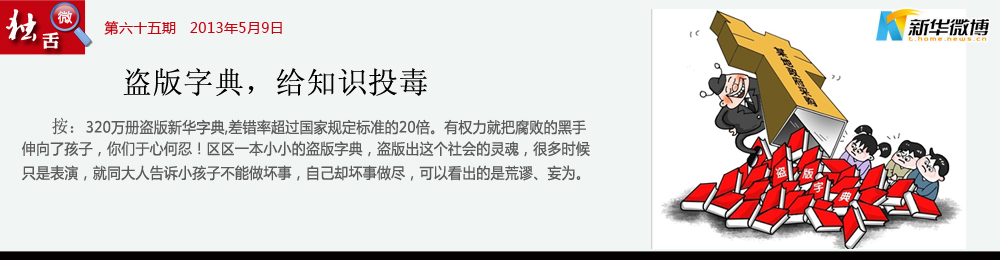 再窮不能窮教育,再苦不能苦娃娃 盜版字典的粗制濫造,差錯率高,誤人子弟,遺害文化。 “三無”產品,盜版發行,無視法規,擾亂出版市場。孩子的啟蒙教育,輕易的毀在盜版字典里。盜版字典,就是“毒字典”,毒害人們的精神。