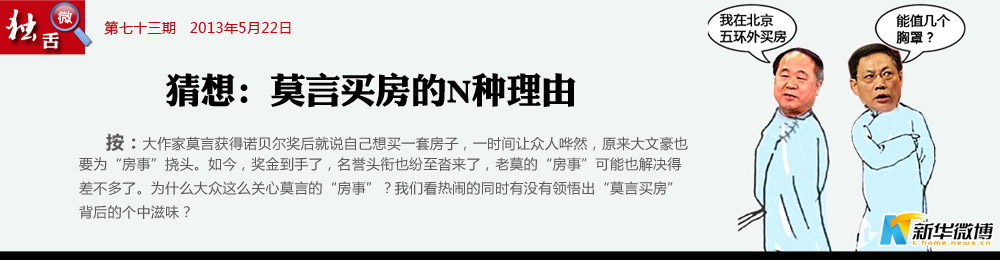 猜想二:安得廣廈五環(huán)外 安居才能樂(lè)業(yè),即便莫言用諾貝爾獎(jiǎng)金買(mǎi)房,也是可以理解的。一直以來(lái),文人的命運(yùn),往往與時(shí)代命運(yùn)息息相關(guān)。居高不下的房?jī)r(jià),卻是百姓之痛。