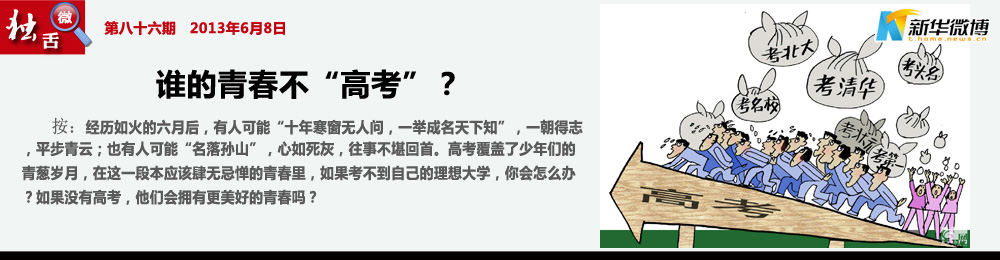 【為經濟做貢獻】 算算高考,用了12年青春,至少四五十萬的學費,我們養活了晨光廠、真彩廠、機讀卡廠、無數造紙廠、無數印刷場,翰林書店、新華書店,城市的交通行業,學校周邊的飯館,以及所有老師的工資獎金、校長的車、油錢……高考是國家支柱型民營企業!這就是我們的功勞!