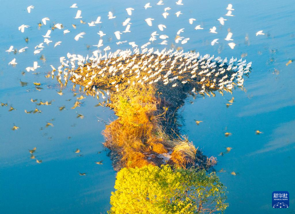 12月8日,群鸟在江苏兴化里下河国家湿地公园内栖息、觅食(无人机照片)。