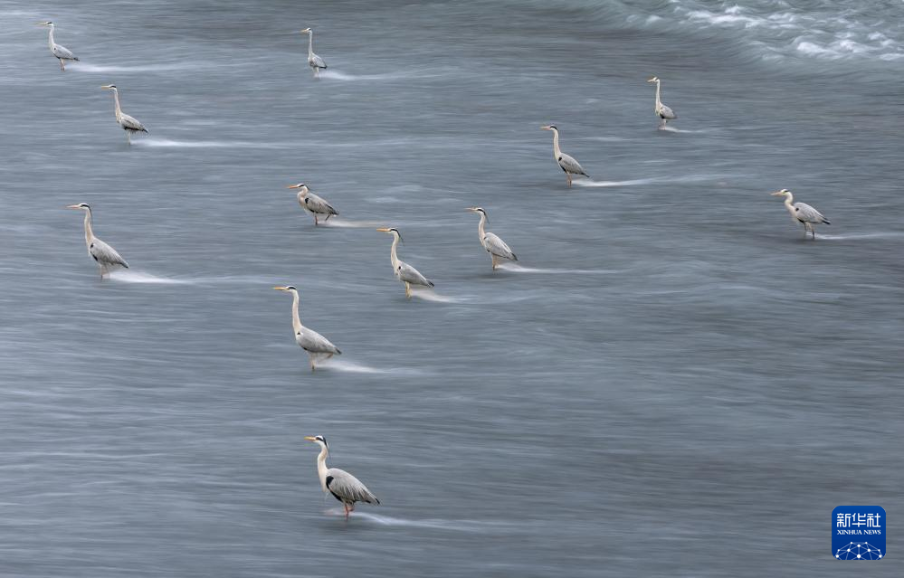 3月17日,一群鹭鸟在成都锦江河道中迎着逆流“站桩”觅食。