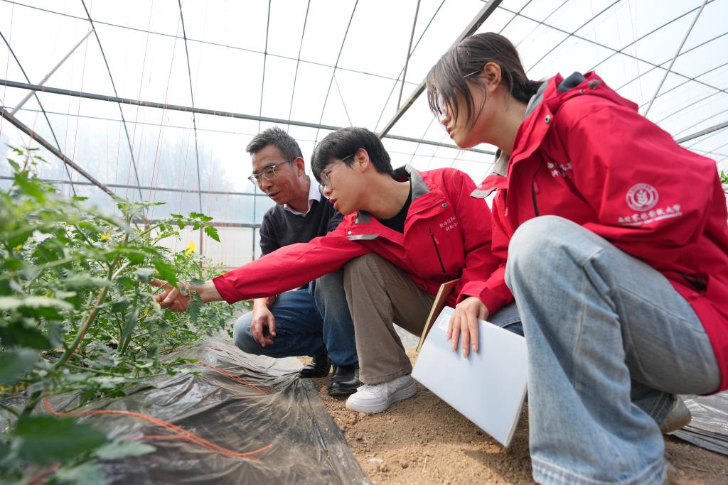 4月9日,张明科(左一)和研究生们在蔬菜大棚内查看西红柿的生长情况。新华社记者 李一博 摄