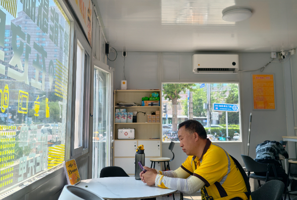 一名外卖员在北京市东城区崇外街道一处“暖新驿站”休息乘凉。新华社记者 鞠焕宗 摄