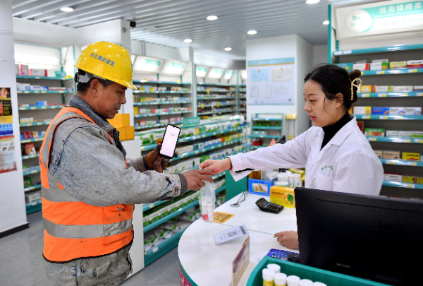 在雄安新区一家药店内,顾客在购买药品。新华社记者 秦婧 摄