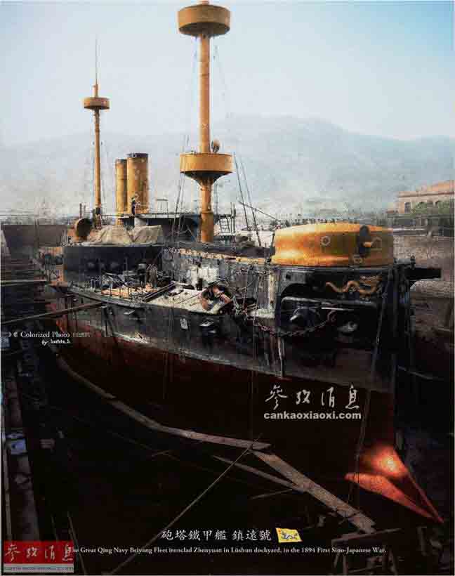 1894年,中日甲午海戰前夕,停泊在旅順船廠船塢進行維護的大清帝國海軍“鎮遠”號戰列艦。
