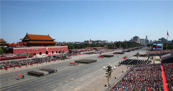 ????2015年9月3日,中國人民抗日戰爭暨世界反法西斯戰爭勝利70周年紀念大會在北京隆重舉行。這是徒步方隊通過天安門廣場。新華社記者 龐興雷 攝