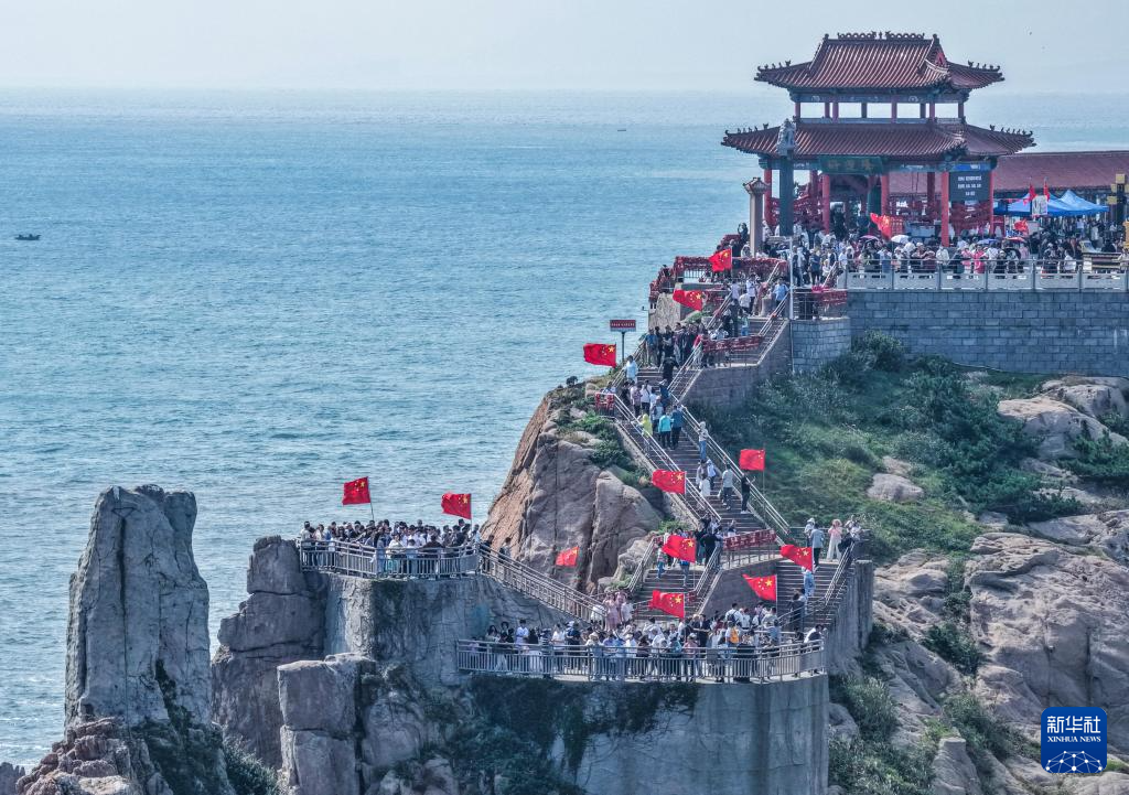 10月4日,游客在山东省荣成市成山头风景区游玩(无人机照片)。